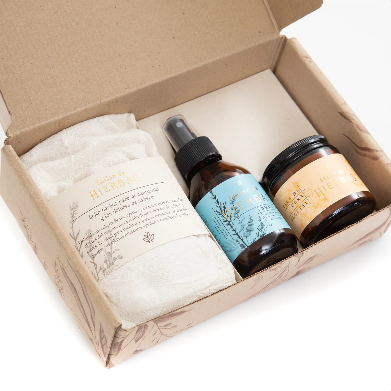 ¡Elige tus favoritos y crea regalos personalizados para esos que llevas en el corazón! Esta caja incluye cojín para cansancio y dolores de cabeza, bruma 120ml y vela de soya en lata
