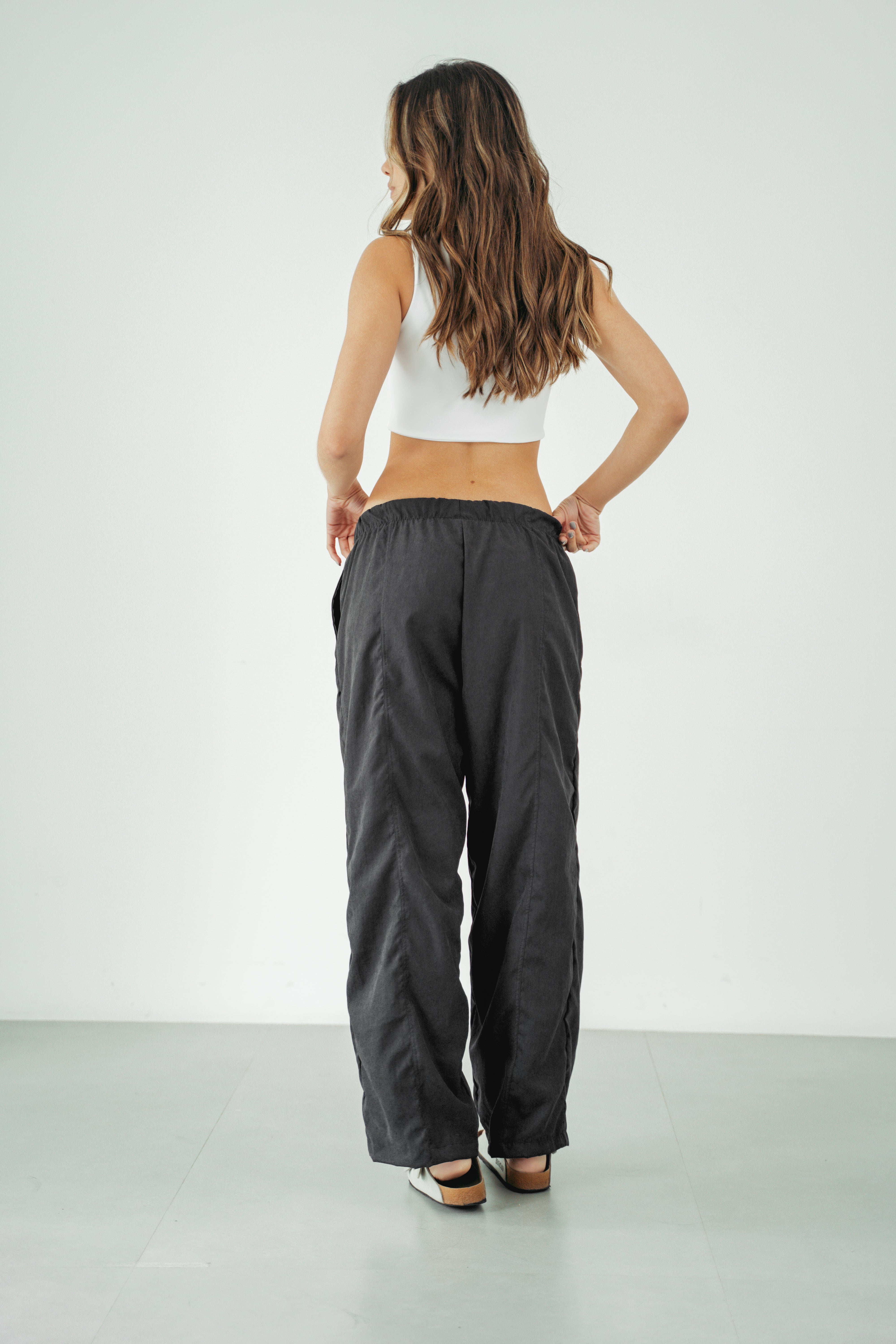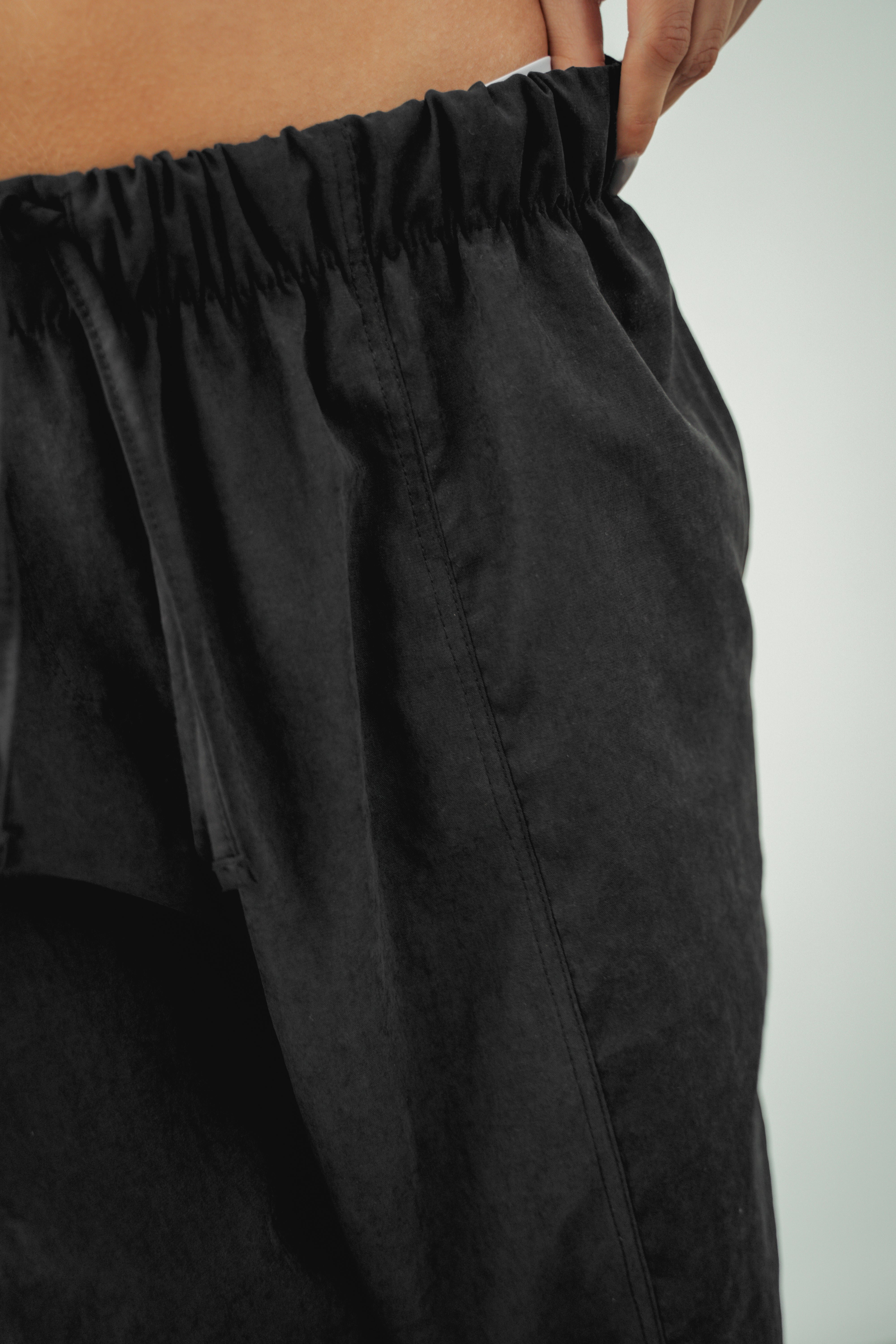 Pantalón Barrel Negro (Silueta Barril), corte holgado de cadera a muslos con bota recta. Bolsillos laterales, elástico en cintura con pretina enresortada, tiro medio y cordón ajustable. Tela ultra ligera y suave.