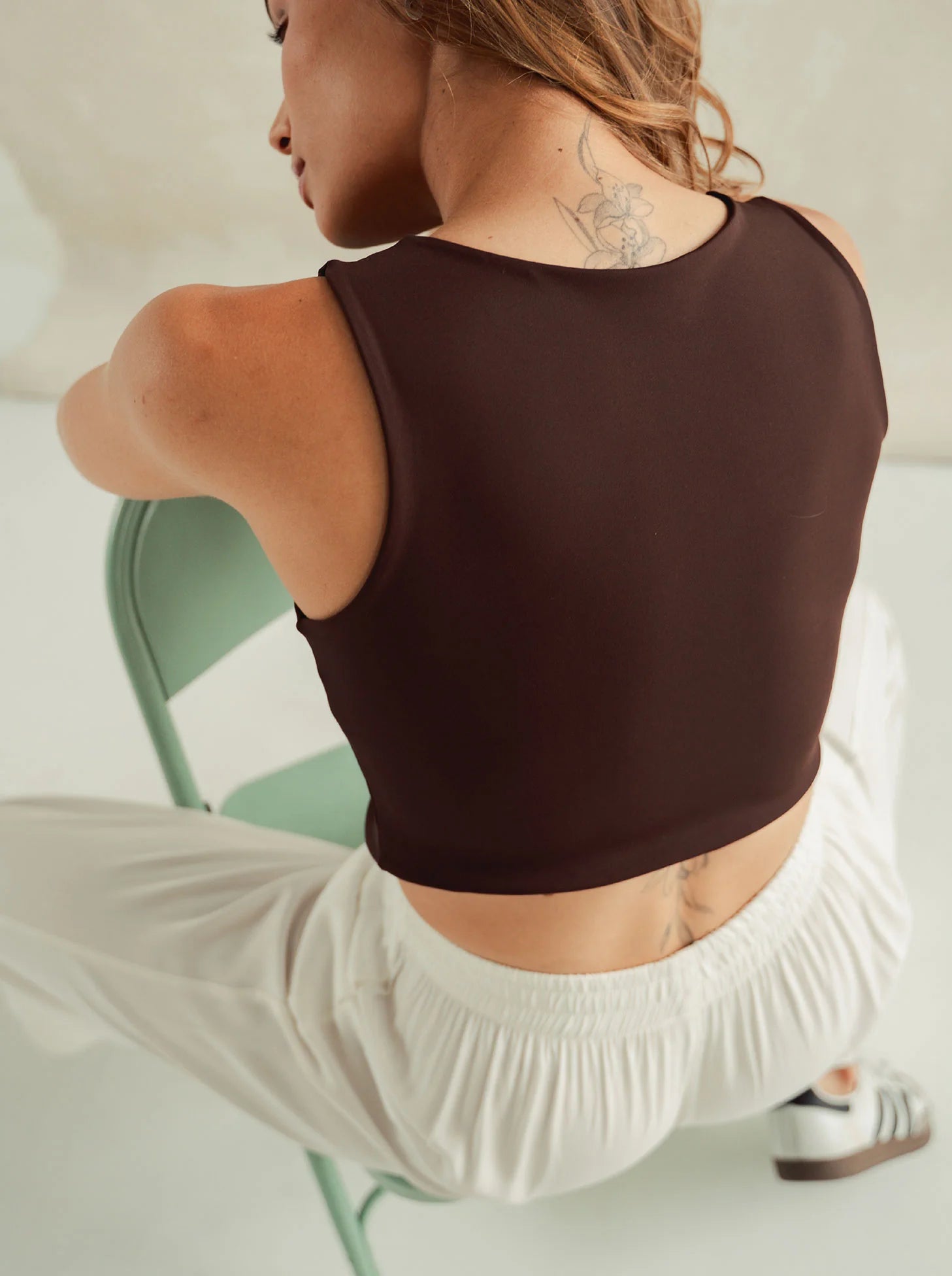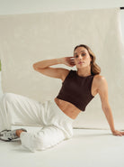 Crop top Café en manga sisa , con escote en curva debajo del busto; Doble tela para evitar transparencias, tejido de punto que logra un ajuste perfecto al cuerpo para dar muy buen soporte y comodidad.