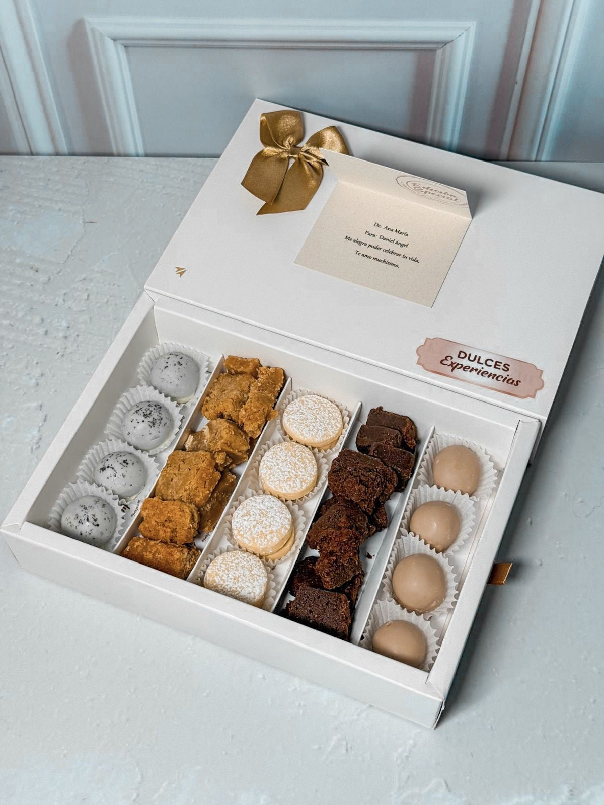 -8 trufas mixtas -4 alfajores -mini bites brownie -mini bites blondie